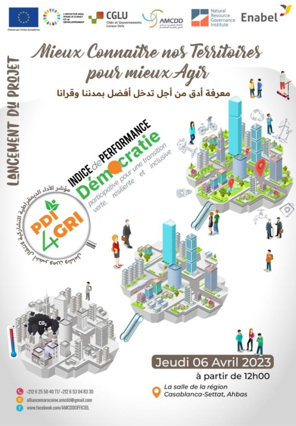 ينظم الائتلاف المغربي من أجل المناخ والتنمية المستدامة (AMCDD) وشركاؤه ، الخميس 6 أبريل 2023 ، بمقر جهة الدار البيضاء سطات ، لقاء لإعطاء الانطلاقة الرسمية لمشروع “مؤشر أداء الديمقراطية التشاركية من أجل انتقال أخضر ، مرن وشامل “(PDI for GRI) . وسيتم خلال اللقاء توقيع اتفاقيات شراكة، وتقديم عروض حول المشروع وأهميته الإستراتيجية للمملكة.