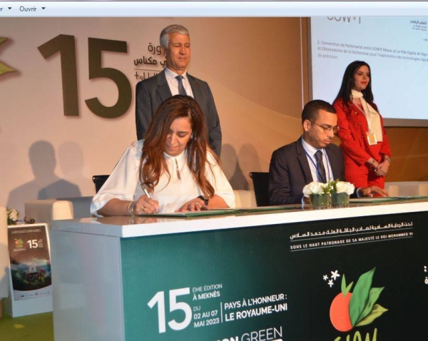 وأما الاتفاقیة الثانیة، فتم توقيعها بین القطب الرقمي للفلاحة ومرصد الجفاف، الممثل بمديرته لبنى المنصوري وSOWIT المغرب، ممثلة بمدیرھا التنفیذي حمزة رخاء شھام. الهدف من هذه الاتفاقیة ھو تطویر شراكة حول استخدام التقنیات الرقمیة في الفلاحة الدقیقة من خلال محورین رئیسیين.