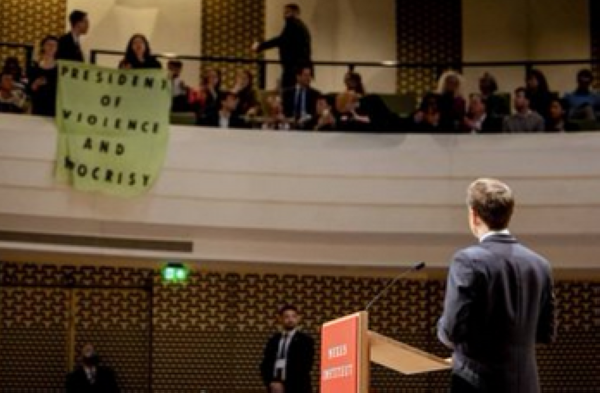 كما وقف متظاهرون ضد ماكرون في دور علويّ بالمسرح، وصرخوا: “لديك ملايين المتظاهرين في الشوارع”، ورفعوا لافتة كتب عليها: “رئيس العنف والنفاق”.